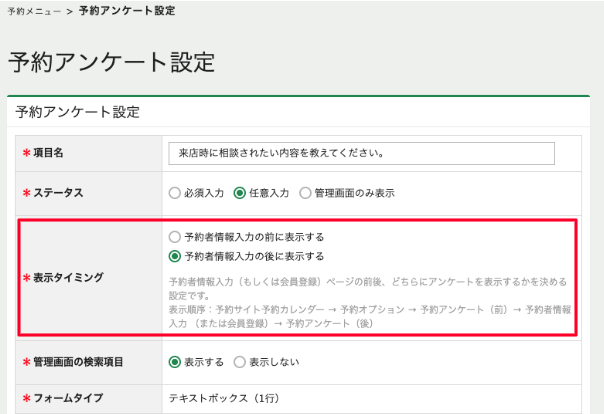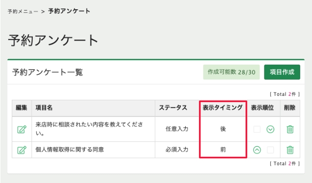 予約アンケート一覧で、表示タイミングの確認ができます。