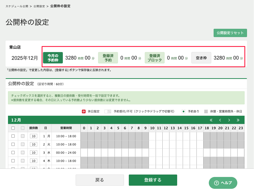 「公開枠の設定」で提供時間・予約時間・空き時間の表示ができるようになりました
