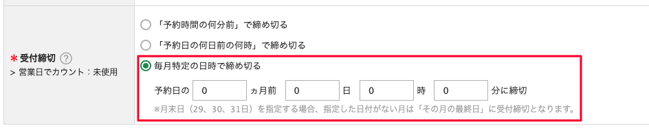 ・「日」に月末日(29、30、31日)が指定された場合、指定した日付がない月は「その月の最終日」が受付締切となります