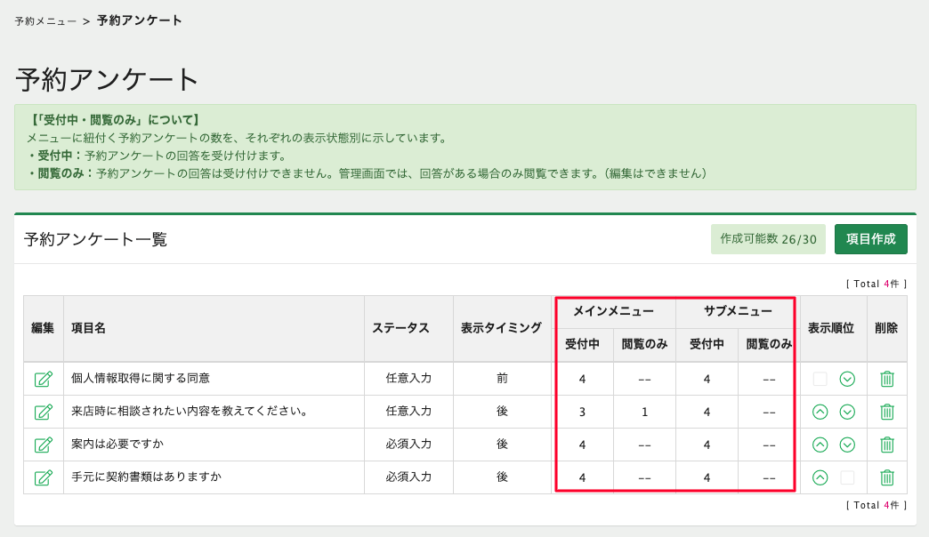 予約アンケートの一覧画面で、各アンケートに紐付けられているメニュー数を確認できるようになりました。