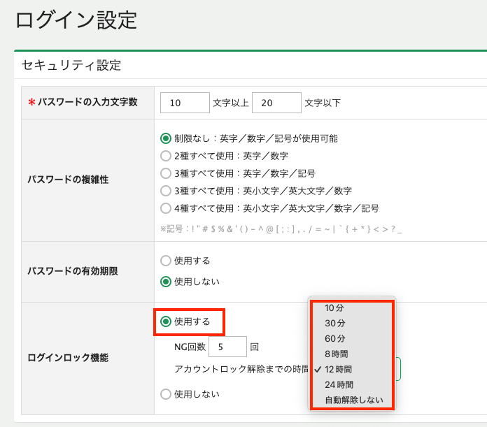 管理画面へのログイン時にパスワード入力を一定回数間違えた場合、