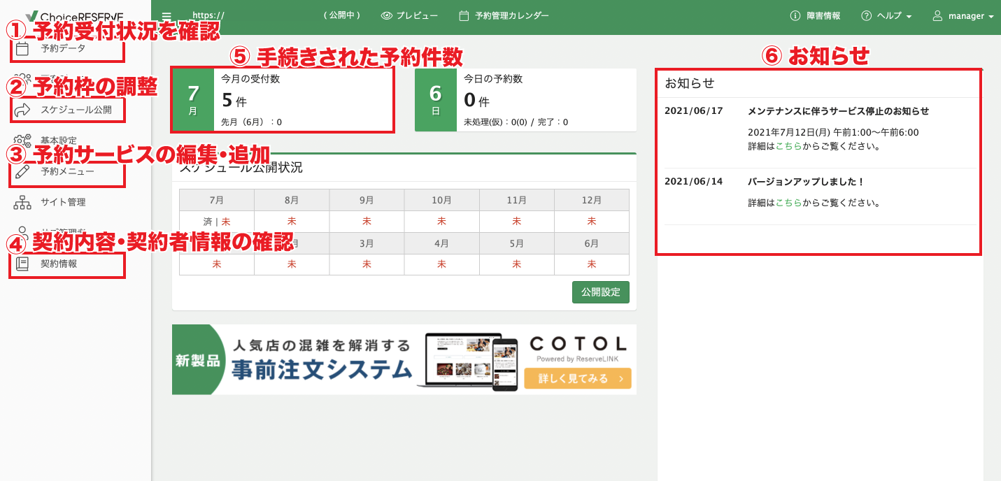 ⑤今月の受付数:今月手続きされた予約件数が表示されます。