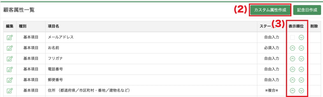 顧客属性一覧の「カスタム属性作成」をクリックします。
