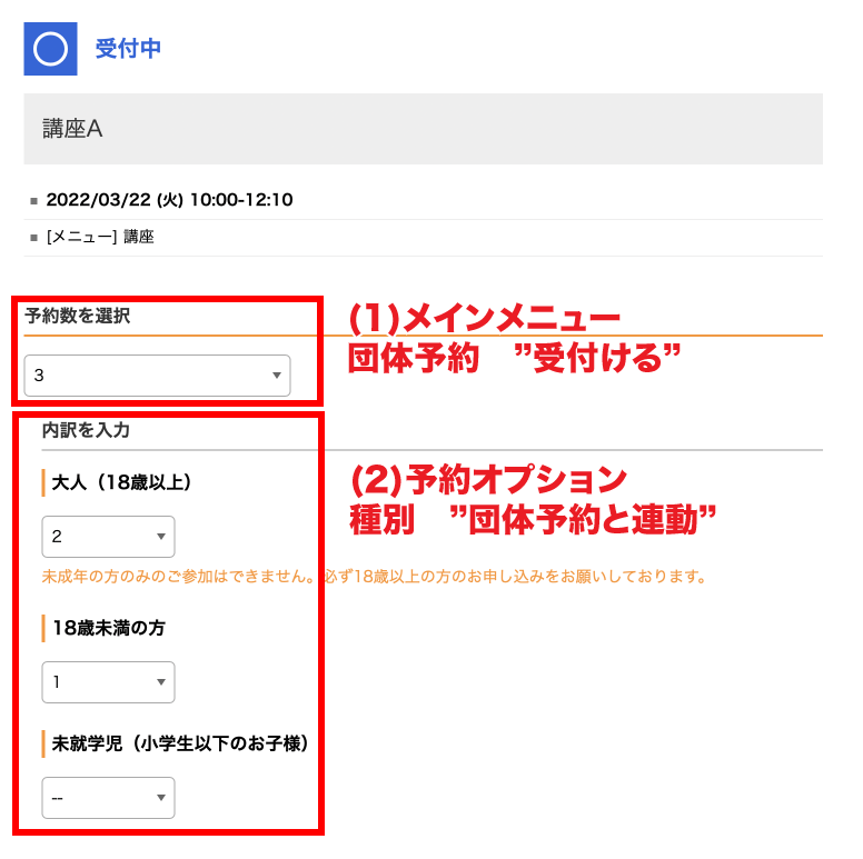 予約人数の内訳を取得したい場合は、予約オプションの"団体予約と連動"を使用します。