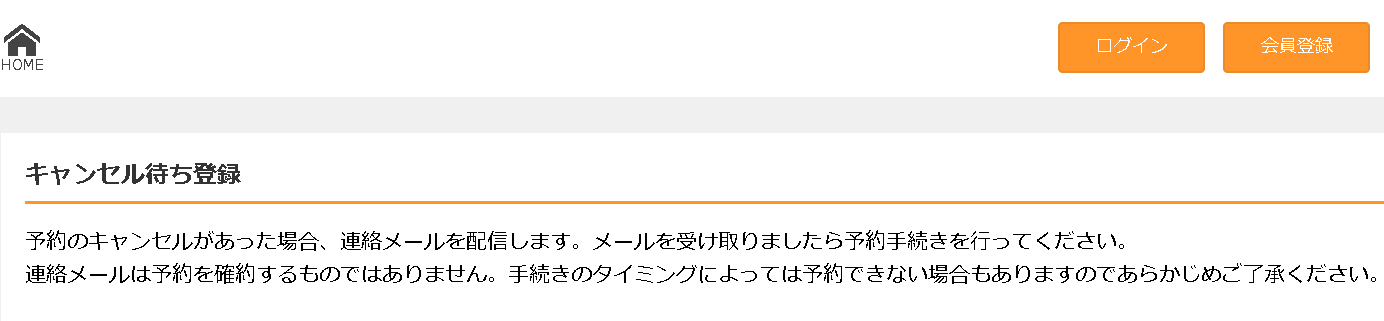 キャンセル待ち登録画面は、既定のメッセージが表示されていました。