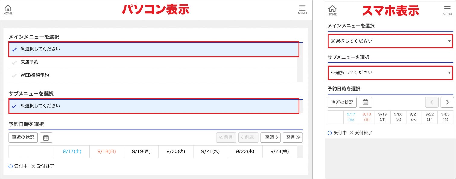 予約サイトのカレンダーにある予約メニュー選択で「※選択してください」と表示できるようになります。