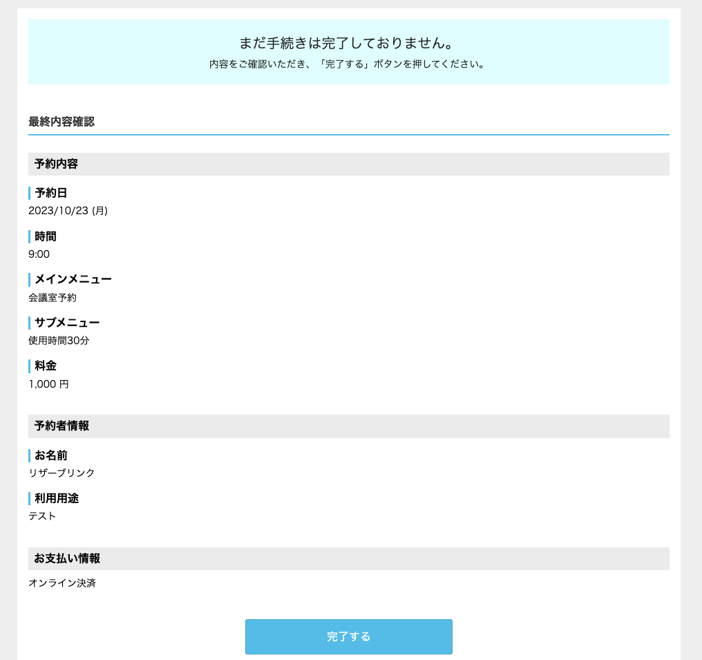 「予約アンケート」を使用し、決済完了後にChoiceReserveの「完了する」をクリックしていただけるような注意喚起を記載いただくことが可能です。