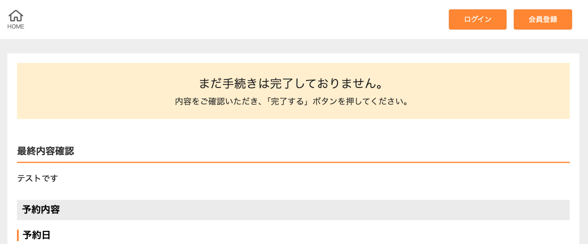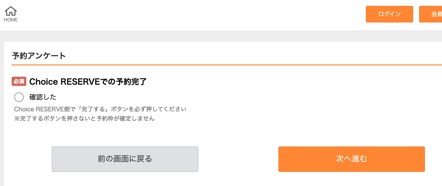 下記のChoiceRESERVE遷移後の画面にて、「完了する」ボタンを押下しないと予約枠は確保されません。
