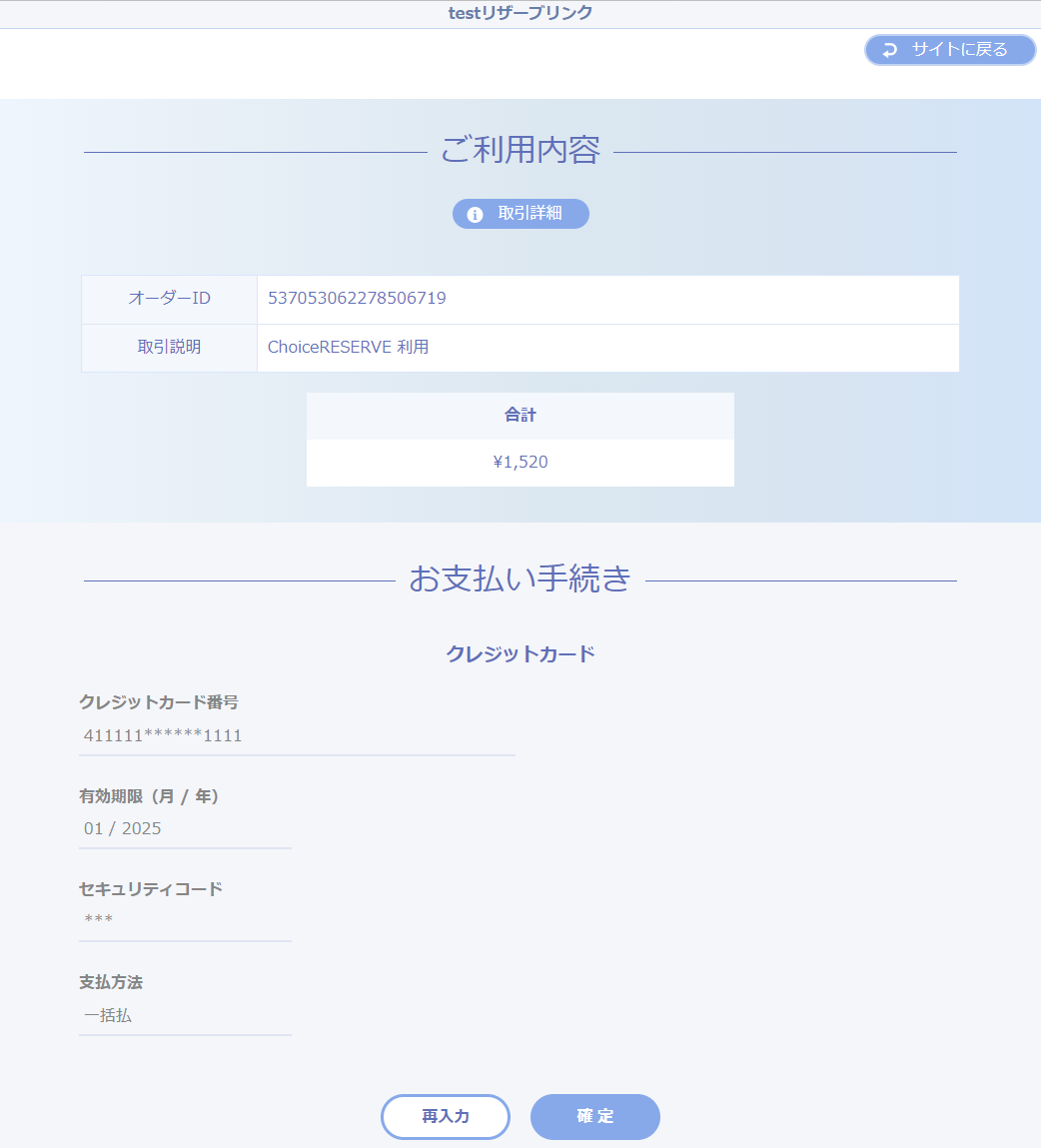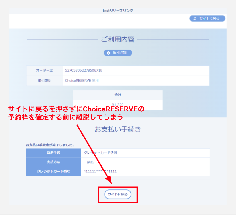 GMO側「結果画面」の「サイトに戻る」を押下せず離脱をしてしまうと予約枠は確保されないのでご注意ください。