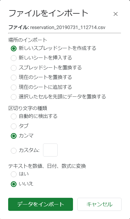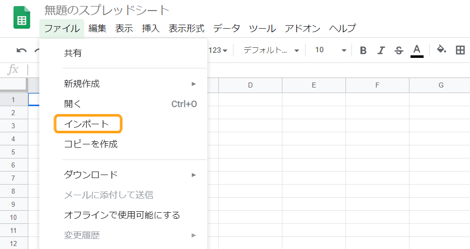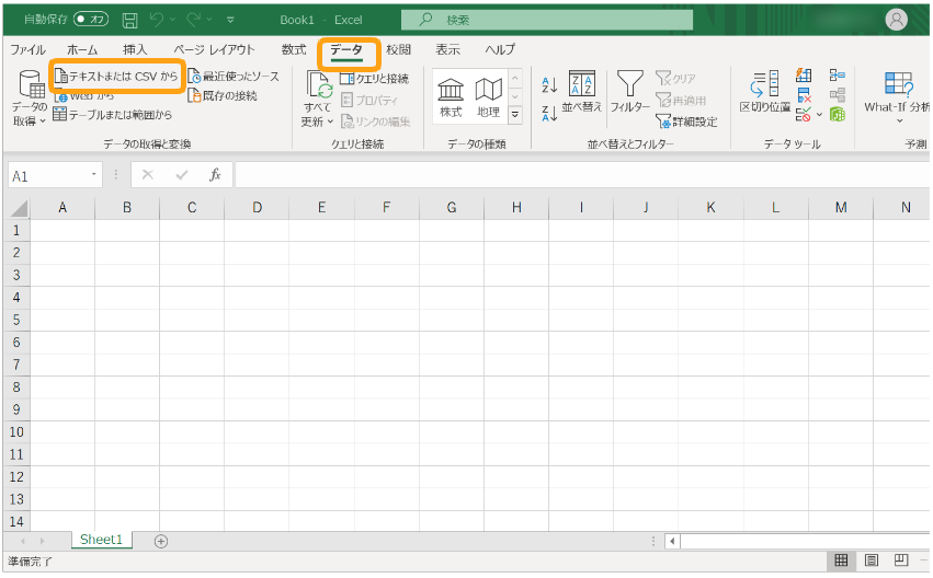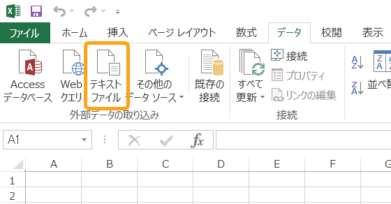 1.メニューの[データ]→[テキストまたはCSVから]を選択
