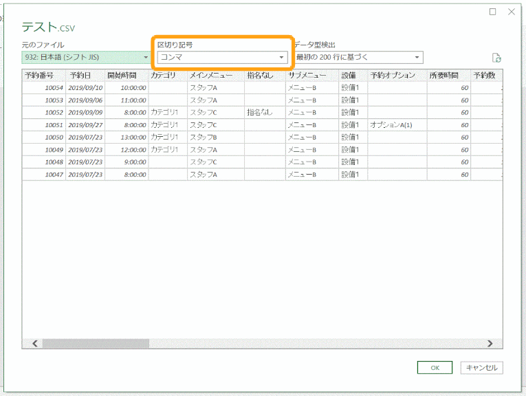 3.区切り記号が「コンマ」になっていることを確認し[OK]
