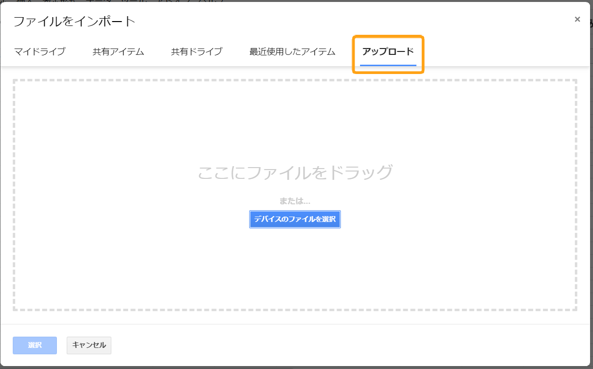 2.[アップロード]を選択し、ファイルをドラッグ&ドロップして「選択」をクリック