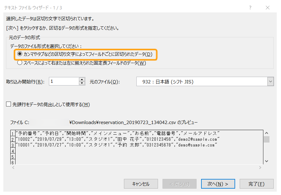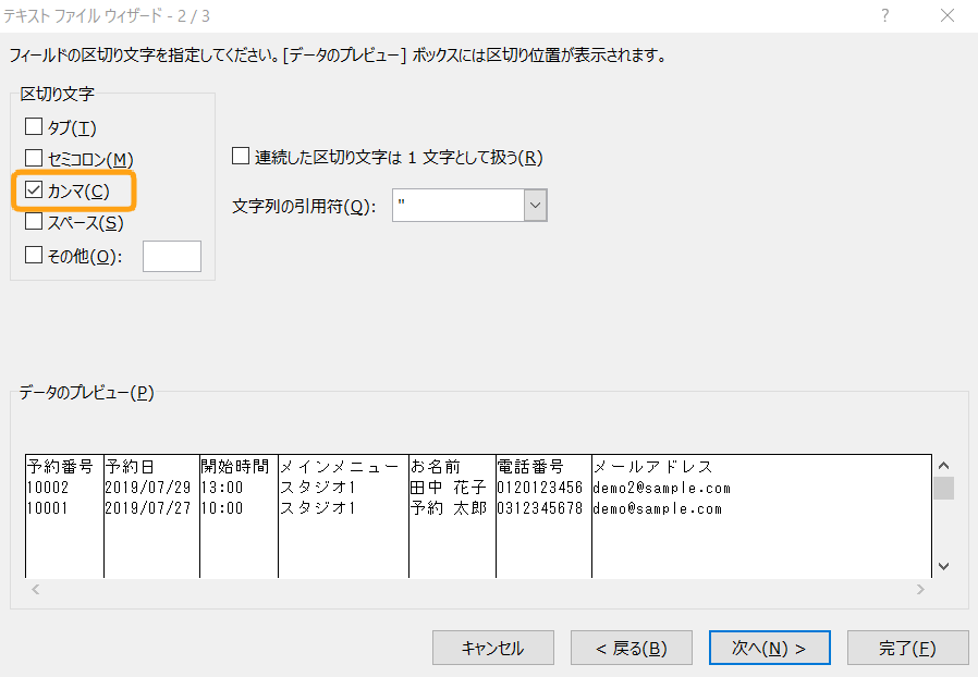 2.「区切り文字」で「カンマ」を選択し、「次へ」ボタンをクリック