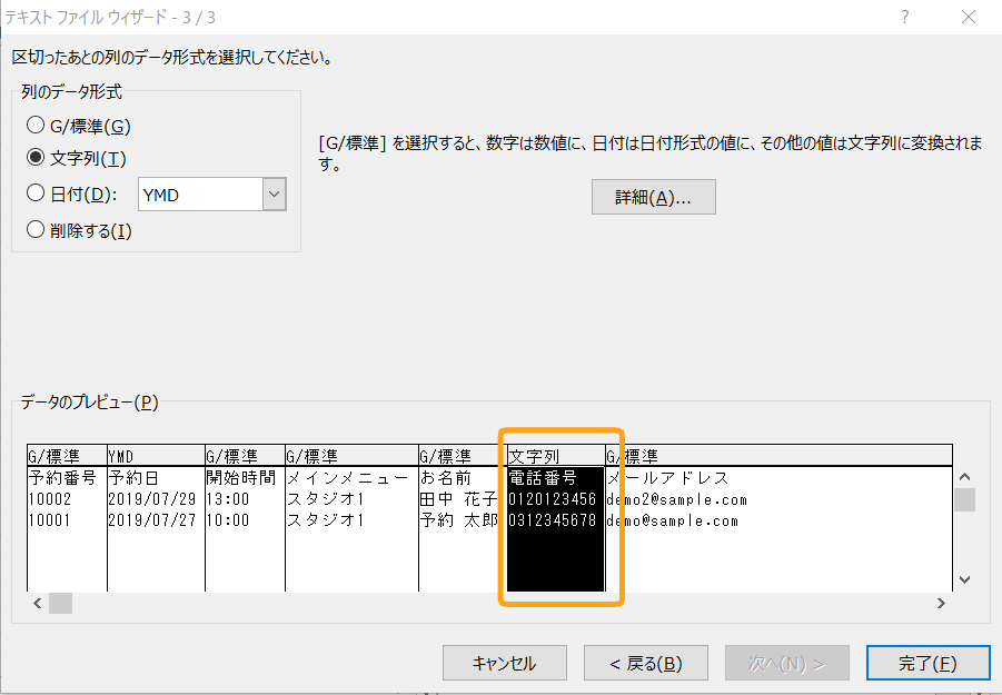 ※「ログインID」「郵便番号」「電話番号」など、文頭に「0」が入る可能性がある列を「文字列」に変更します