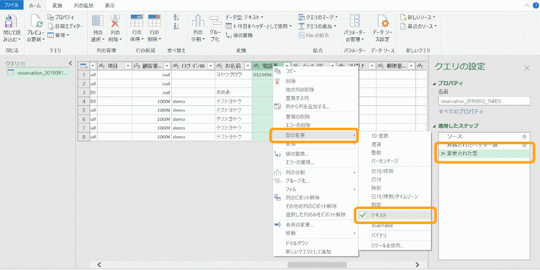 2.自動変換されたくない列の列見出しを右クリックし、[型の変更]>[テキスト]を選択