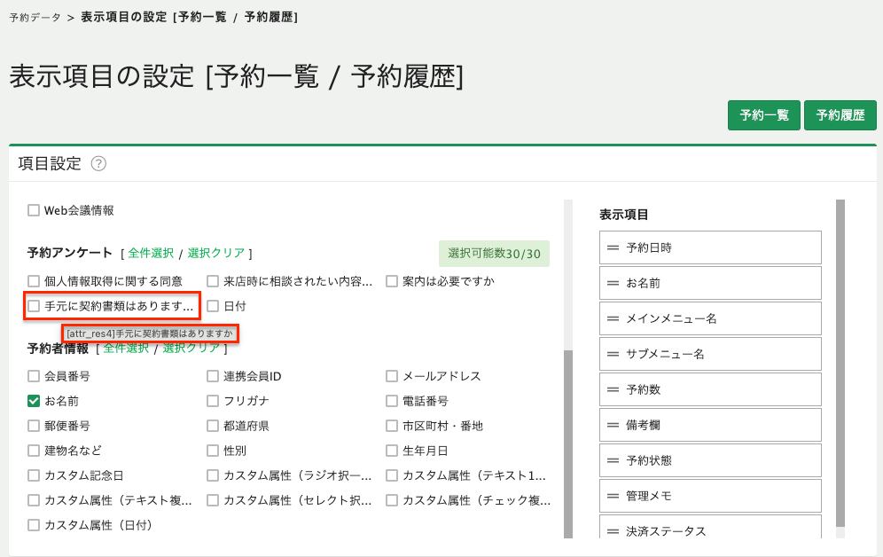予約アンケートをメニューに紐付ける際や、予約一覧の表示項目を設定する際に、アンケートIDを表示し、判別できるようになりました。