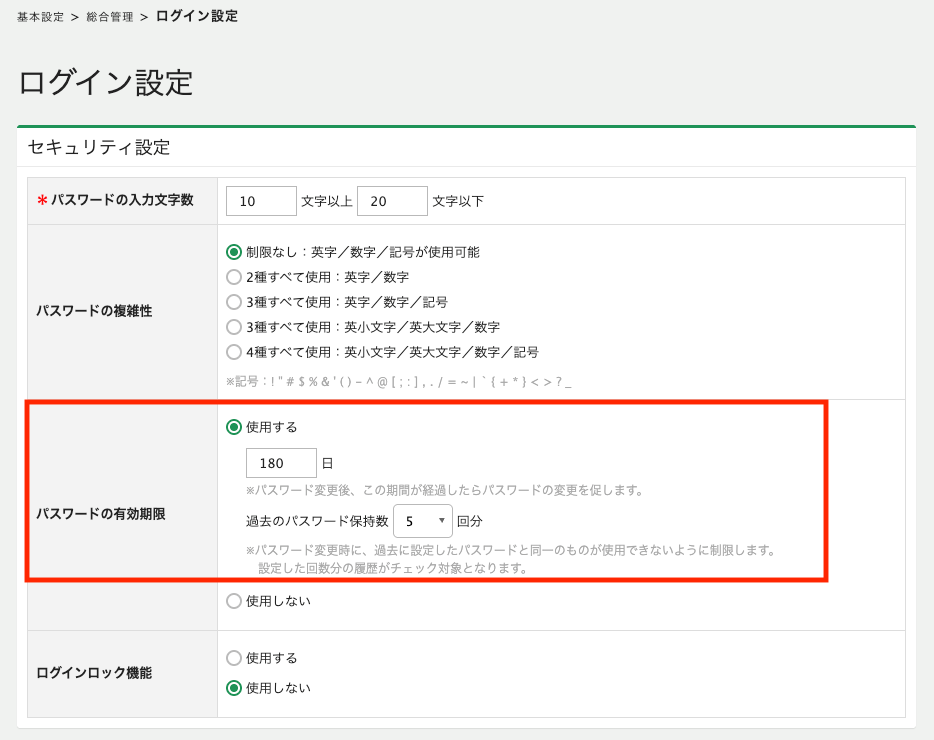 「パスワードの有効期限」を【使用する】に設定している場合、パスワードの保存数を選択できるようになりました。