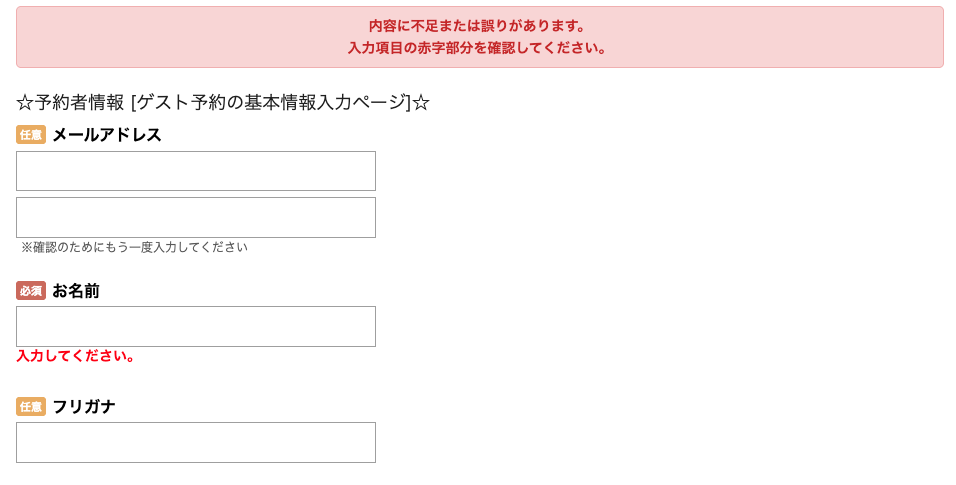 予約サイト内のフォーム入力時に表示されるエラーメッセージの表示内容を改善します。
